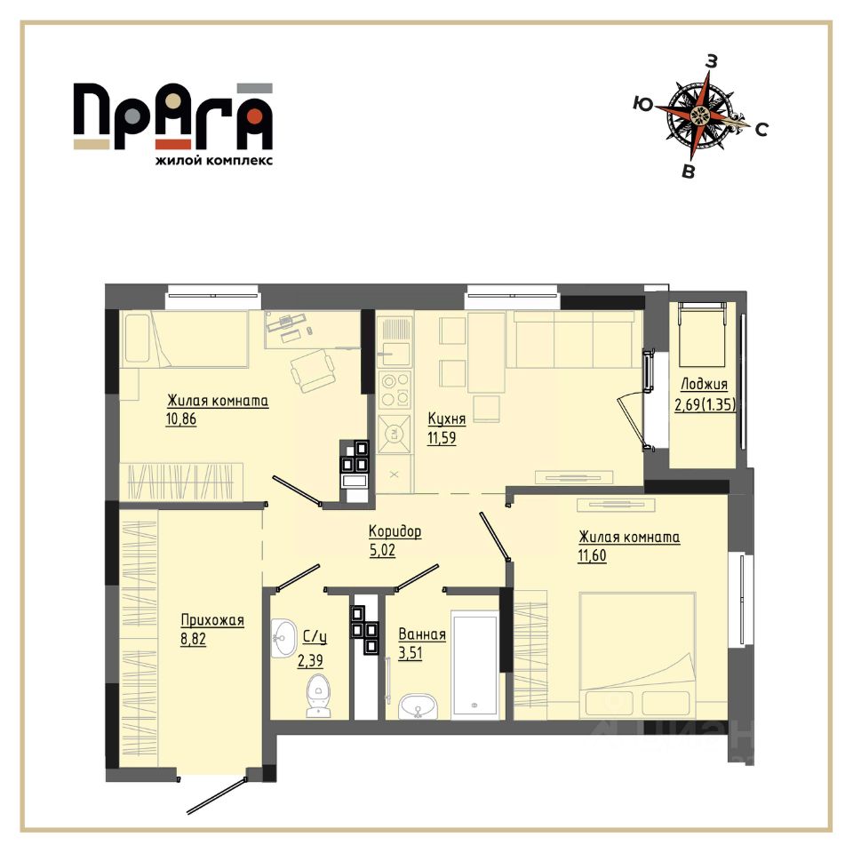 59,44 квадратных дружных метров для семьи. Приветствуем вас в квартире ЖК РИО, где каждый уголок говорит: ''Да, мы семья!'' Кухня-гостиная: Это сердце дома, где мама готовит вкусности. Здесь можно не только смотреть телевизор, но и проводить семейные советы на тему кто моет посуду. Удобный диван, чтобы каждый член семьи мог найти себе место. Спальня родителей: Тихая гавань, где можно спрятаться от шума и беготни. Детская: Место, где игрушки живут своей жизнью. Ванная комната: Здесь можно не только принимать душ, но и устраивать водные бои с резиновыми уточками. Прихожая: Шкаф - первое, что видят гости, входя в дом. Здесь можно оставить свои верхнюю одежду, зонты и обувь. Зеркало, чтобы проверить, не забыл ли ты что-то важное, например, ключи от машины. Надеемся, это описание принесло вам улыбку! Калинка Групп. Яркая жизнь в каждом²
