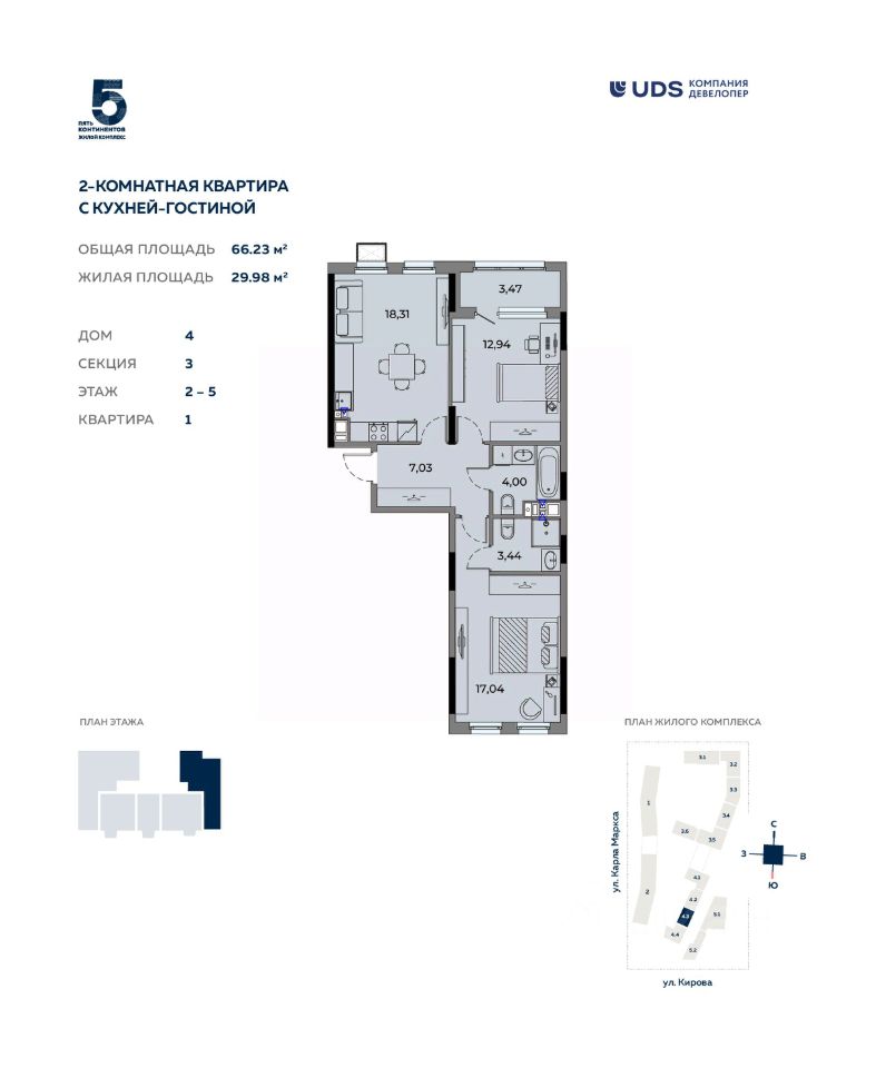 ЖИВИТЕ В ЦЕНТРЕ! Продаётся 2-комнатная квартира с кухней-гостиной от девелопера UDS в ЖК ''Пять континентов'', дом 4, секция 3 на 5 этаже. Общая площадь — 66,23 м². Выбирайте квартиру в топовой локации Ижевска, чтобы всё успевать сегодня и создавать надёжный актив на будущее. Самый центр города — район, где кипит жизнь: на работу — без пробок, до школы — пешком. — Вдоль домов появится пешеходный бульвар для прогулок и встреч. — 15 минут до набережной и Центральной площади. Рядом детские сады 235, 189, 287, 241, 73, школы 5, 88, 11, 22, 27, частные школы SOK, NOVA, развивающие центры: Маленький гений, Сова, Знайка, АБВГД+, Tosky Talky, Cherry-Pick, Оранжевый лев, Монтессори-дворик, Слушарики. Лицей 29 — всего две остановки на трамвае. — Закрытый двор без машин — спокойно отпускайте ребёнка играть с друзьями. — Внутри комплекса — тишина и безопасность, вокруг — динамика центрального района. — Для автомобилистов: подземный паркинг и наземная стоянка. — Все виды общественного транспорта. Остановка — ''магазин Океан''. Кафе и магазины — на 1 этаже. Сервисы отеля у вас дома — уборка в подарок на первые 6 месяцев. Забудьте о бытовых хлопотах в новой квартире. Удобная планировка для семьи: • Кухня-гостиная 18,31 м² — собирайтесь вместе за большим столом. • Две спальни на разные стороны света - больше приватности: детская 12,94 м² с лоджией, родительская мастер-спальня 17,04 м² • Два санузла — удобно для всех • Всего 7 этажей в доме меньше соседей, больше приватности Передача ключей — до 30 марта 2028 года. Первые дома уже сданы. Пройдите тест-драйв ЖК — приглашаем на экскурсию. Специальные условия покупки от UDS: • Рассрочка 0% — без переплат. • Трейд-ин — обменяем вашу квартиру на новую. • Банковские программы — рассчитаем на месте. Звоните, пишите — поможем подобрать оптимальные условия. ЖК ''Пять континентов'' — для жизни и инвестиций. Жильё в центре — ликвид, с которым вы всегда в плюсе.