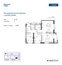 Четырехкомнатная квартира евро-планировки в 25-этажной секции ЖК ''''Речной парк'' дом 2. Выходит на 2 стороны света, окна на юг и восток. Кухня-гостиная почти 19 м2, правильной формы - здесь удобно расположить и кухонный гарнитур, и зону гостиной с диваном и обеденным столом. 3 отдельные спальни, в каждой запланировано место для вместительного шкафа. В одной из комнат - выход на теплую остекленную лоджи. В квартире 2 санузла, в одном из них можно установить стиральную машину. В прихожей грязная зона отделена от жилой части квартиры, есть ниша для шкафа под уличную одежду и обувь.Квартира светлая - увеличенные оконные проемы, уровень подоконника 60 см от пола, высота окна 1,7 м.При покупке недвижимости в домах UDS вы получаете в подарок 6 или 12 месяцев дополнительного сервиса отельного уровня. В зависимости от пакета в программу входит: масштабная уборка после ремонта, генеральная и регулярная поддерживающая уборка, химчистка мебели, мойка окон, глажка вещей, личный шеф-повар на праздник. Наслаждайтесь жизнью в новой квартире с первого дня и не думайте о бытовых вопросах.