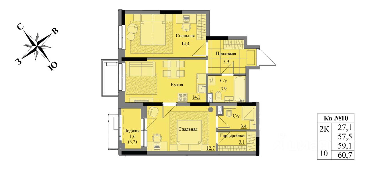 Общая площадь59,1 м2