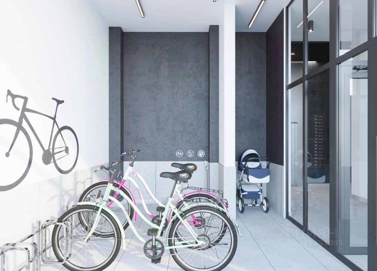 На первых этажах размещаем просторные колясочные. Вы сможете оставить коляску, велосипед или электросамокат на первом этаже, не поднимая их до своей квартиры, и они не будут занимать место в вашей прихожей или кладовке. В колясочных предусмотрены поддоны для мытья колес велосипедов и детских колясок, а также лап ваших домашних питомцев. Перед входами в подъезды предусмотрены велопарковки. Из окон А14 будут открываться замечательные виды на пойму реки Позимь, лес микрорайона ''Ракетный''.
