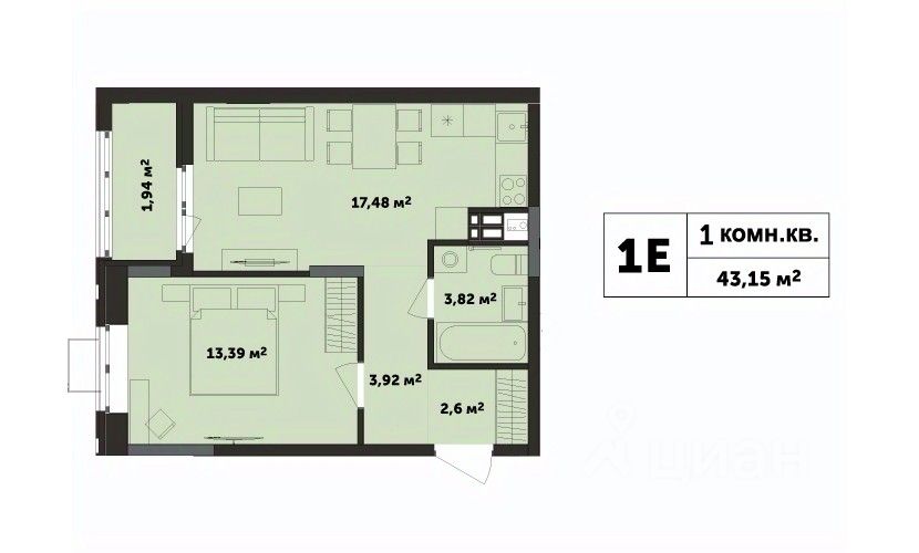 Общая площадь42,87 м2