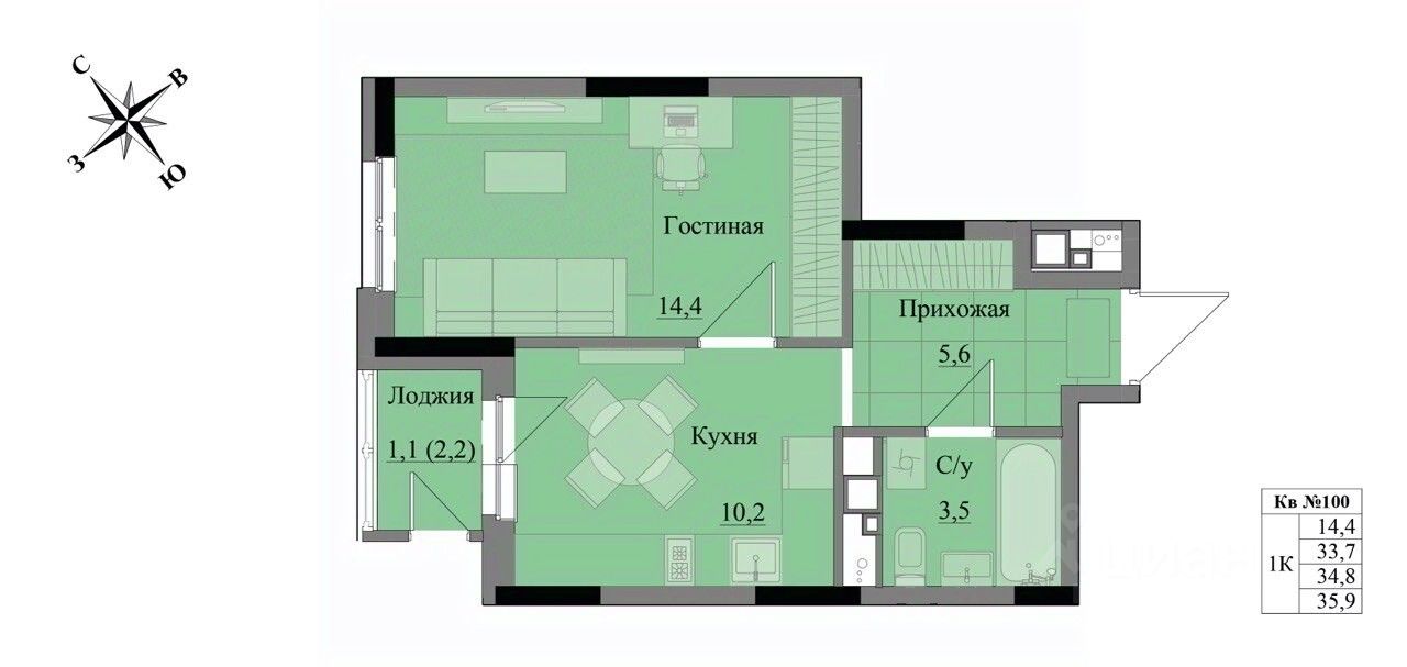 Общая площадь34,8 м2