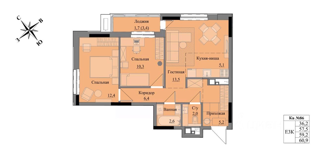 Общая площадь59,2 м2