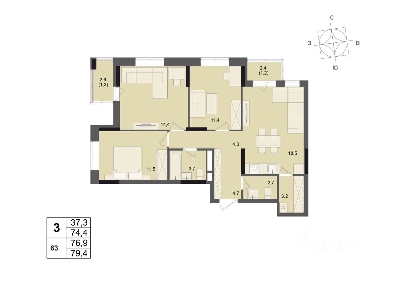 Общая площадь76,9 м2