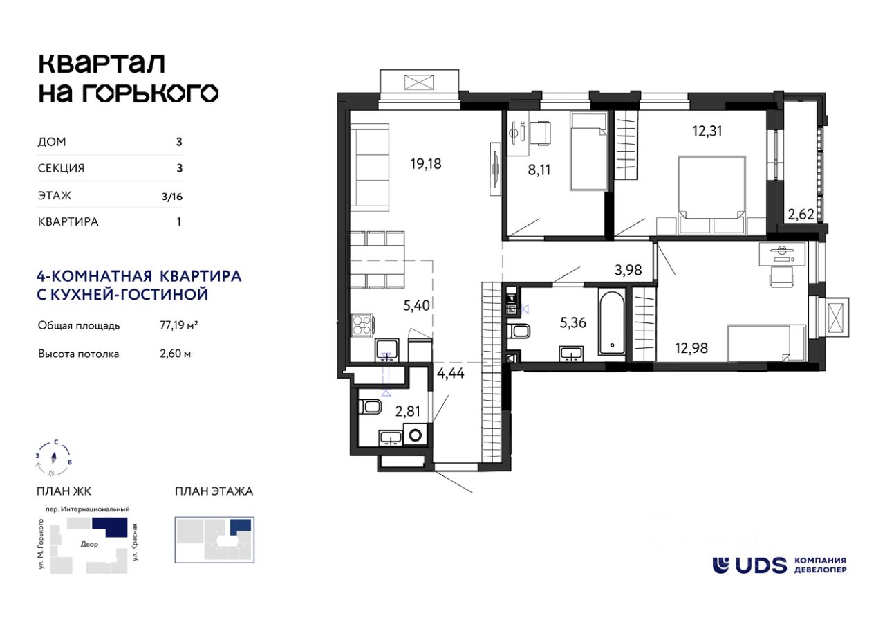 Два дома уже построены и заселены. Идёт строительство последнего дома комплекса — можно переехать сразу в готовую инфраструктуру в центре Ижевска. ''Квартал на Горького'' — современный жилой комплекс от UDS в историческом центре Ижевска: — 10 минут до набережной и Летнего сада — 2 минуты до остановки, 22 маршрута транспорта — Школа 25, школа искусств 2, детские сады и театры — в шаговой доступности — Невысокая застройка — дома от 6 до 16 этажей — Огороженный двор без машин, безопасный для детей — Планировки - от студий до трехкомнатных — Индивидуальные кладовые