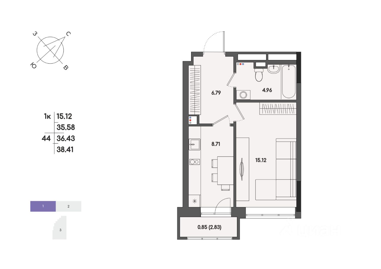 Общая площадь36,43 м2