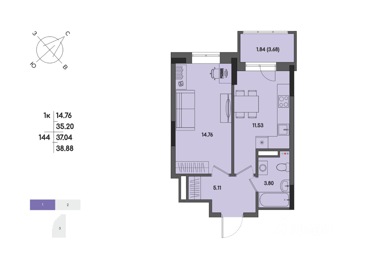 Общая площадь37,04 м2
