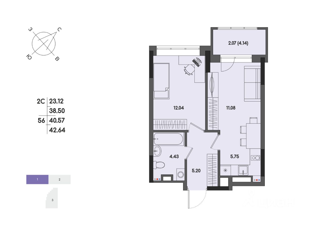 Общая площадь40,57 м2