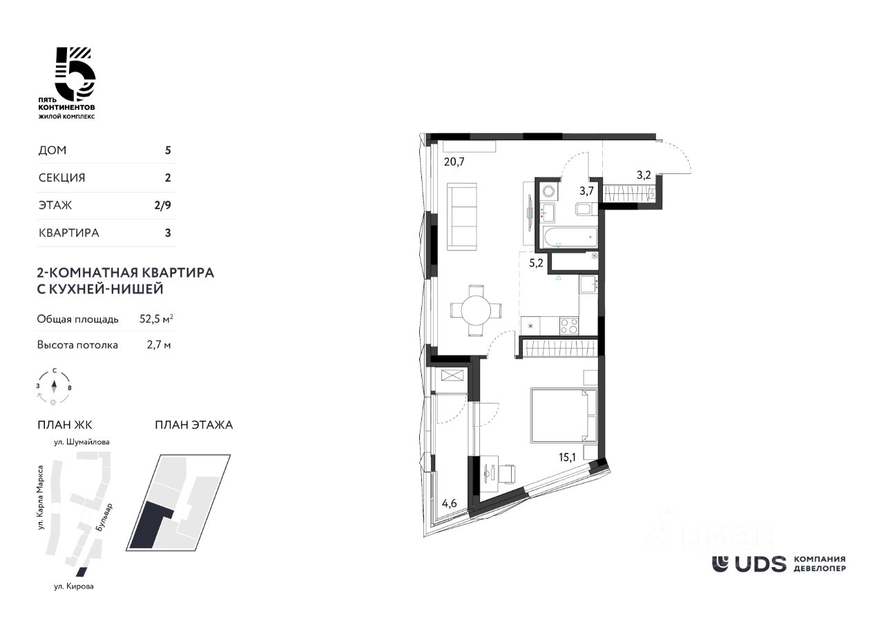 Продаётся 2-комнатная квартира с кухней-гостиной от девелопера UDS в ЖК ''Пять континентов'' в финальном доме комплекса 5. Секция 2 на 2 этаже. Общая площадь — 52,5 м².