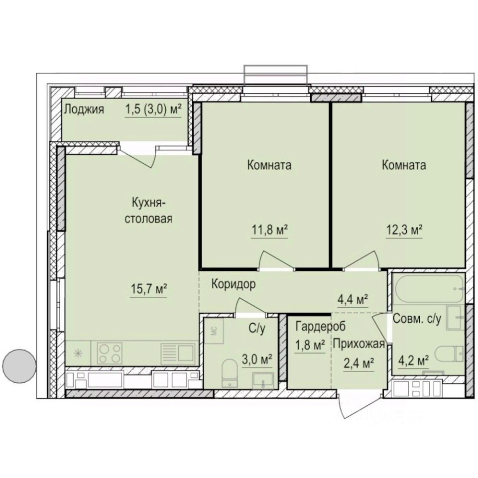 Продаётся 2-комнатная квартира в строящемся доме (Дом 1), срок сдачи: III-кв. 2028, общей площадью 57.1 кв.м., на 12 этаже.