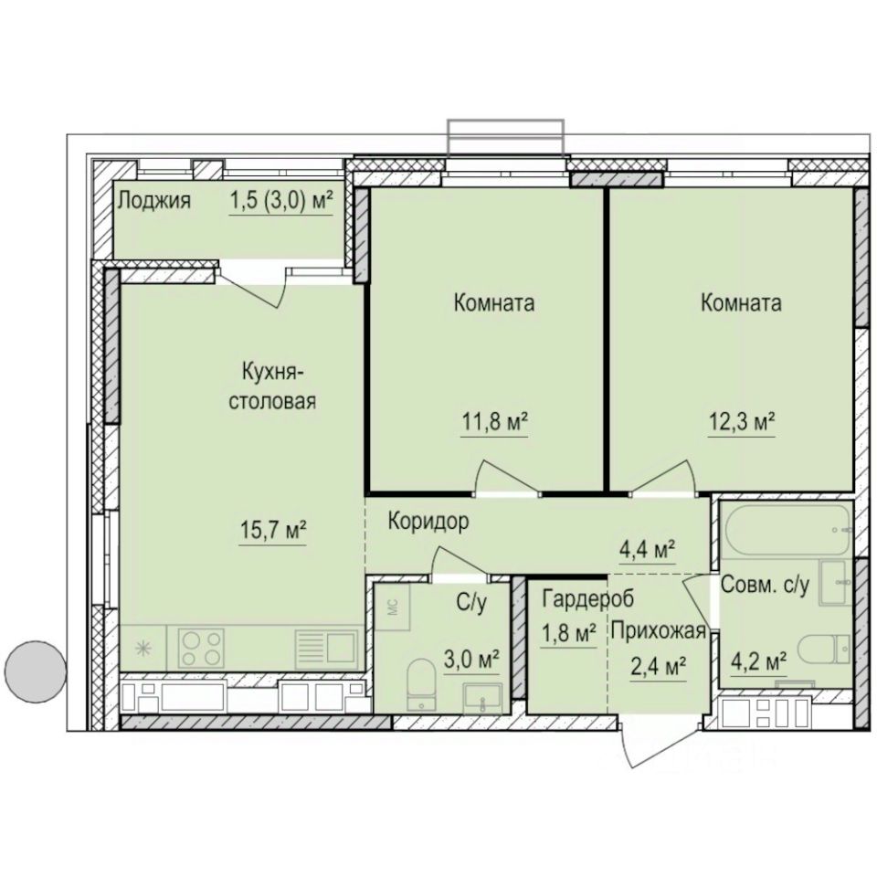 Общая площадь57,1 м2