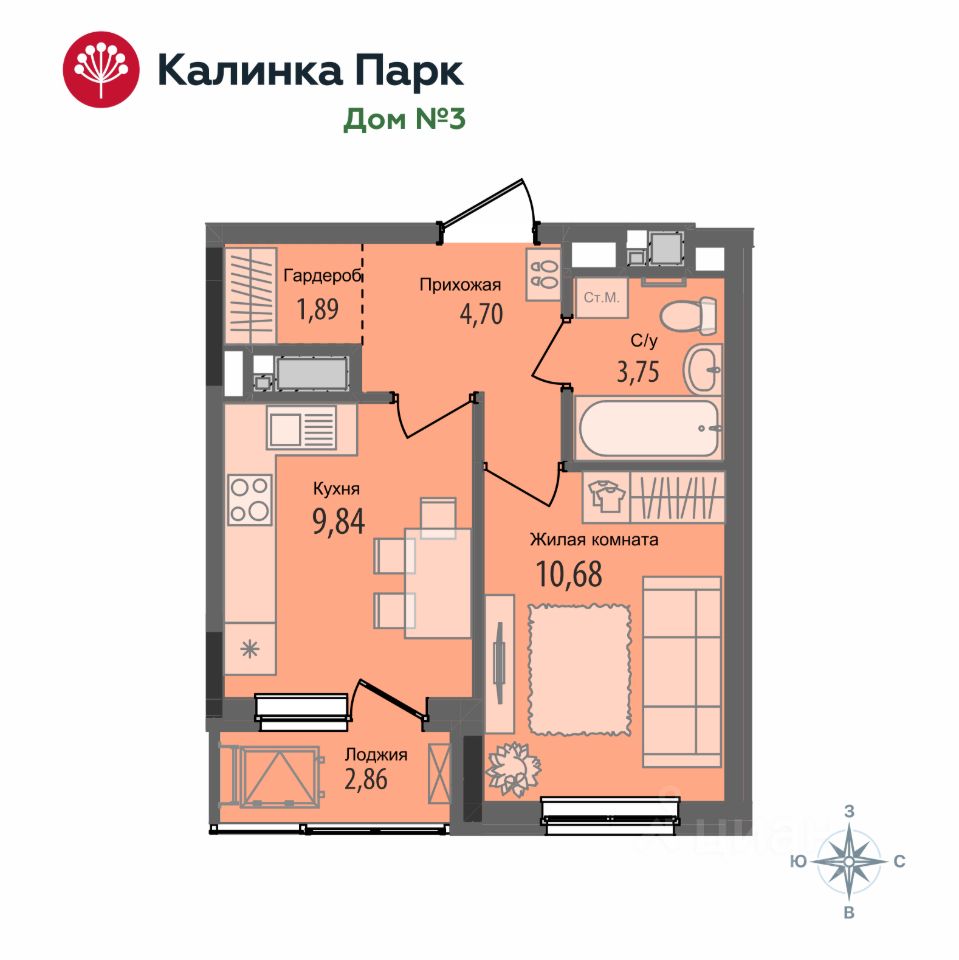32,29 м² в доме 3 микрорайона Калинка Парк.