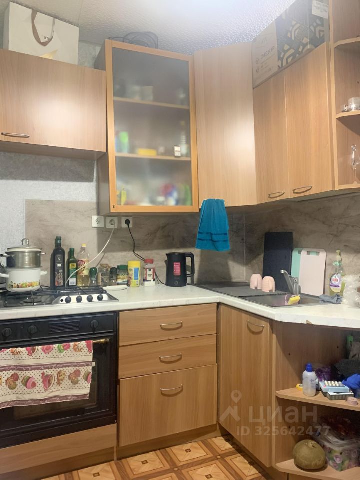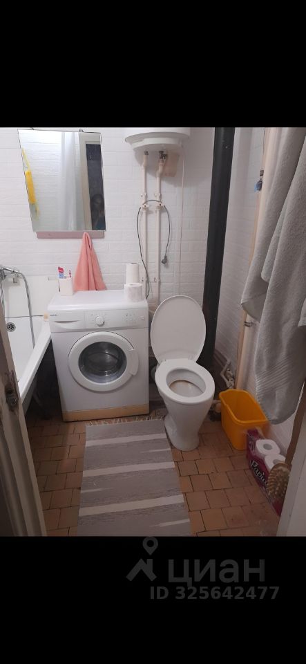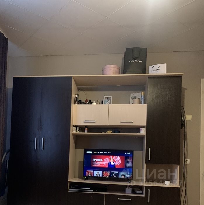 Светлая, большая комната, из мебели есть стенка, угловой шкаф, небольшой телевизор, кухонный гарнитур, стол стулья, стиральная машина, водонагреватель, единственное нет кровати-дивана
