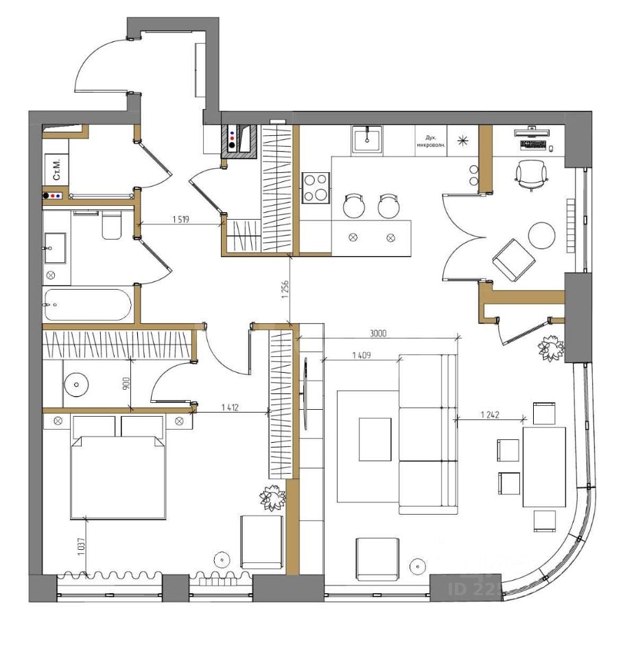 Продуманная система хранения включает гардеробную, кладовые и встроенные шкафы до потолка, что обеспечивает идеальный порядок. Планировка функциональна: просторная кухня-гостиная с выходом на лоджию и изолированный кабинет за стеклянным панорамным остеклением, обеспечивающим тишину и свет.