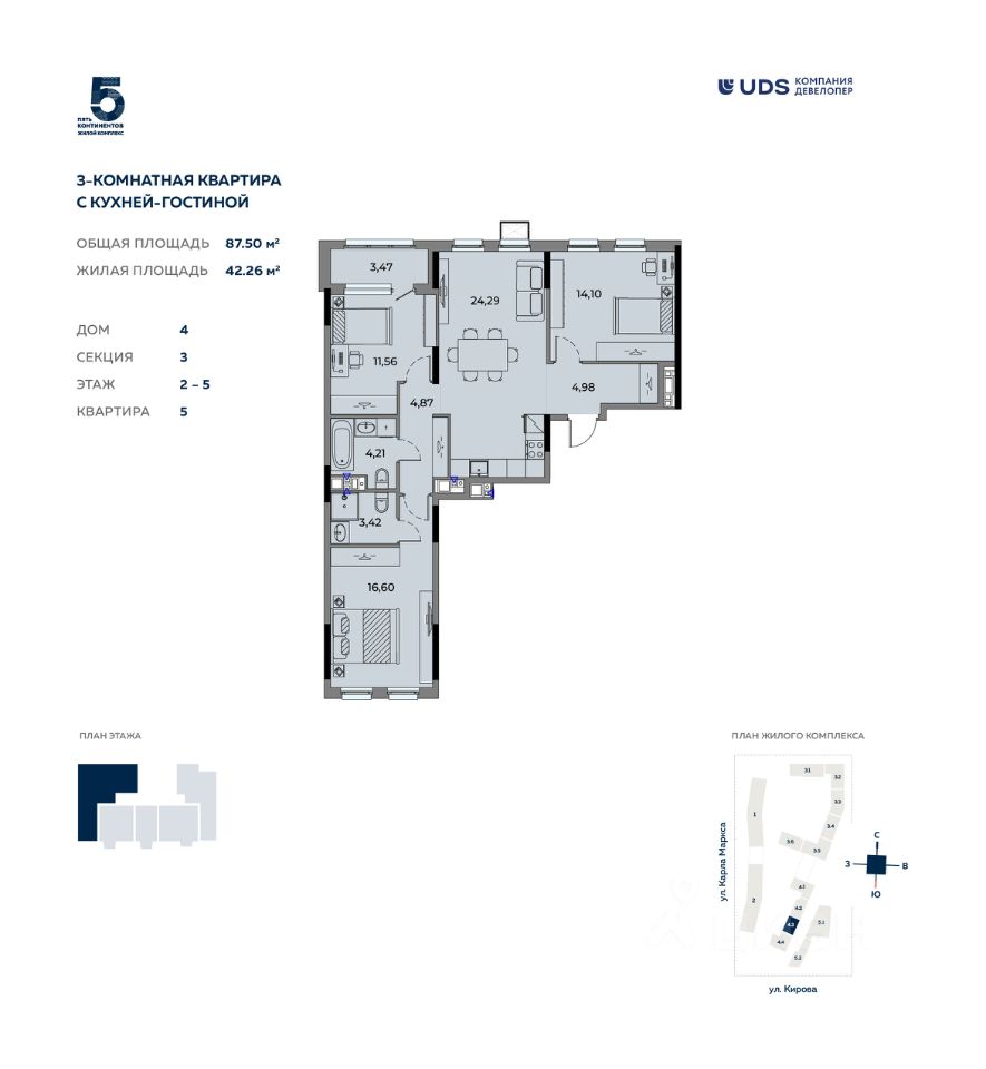 Продаётся 3-комнатная квартира с кухней-гостиной от девелопера UDS в ЖК ''Пять континентов'' в 4 доме комплекса. Секция 3 на 3 этаже. Общая площадь — 87,5 м².