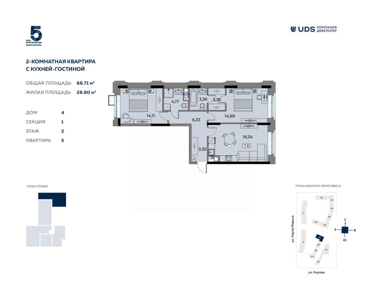 Продаётся 2-комнатная квартира с кухней-гостиной от девелопера UDS в ЖК ''Пять континентов'', дом 4, секция 1 на 2 этаже. Общая площадь — 68,71 м².
