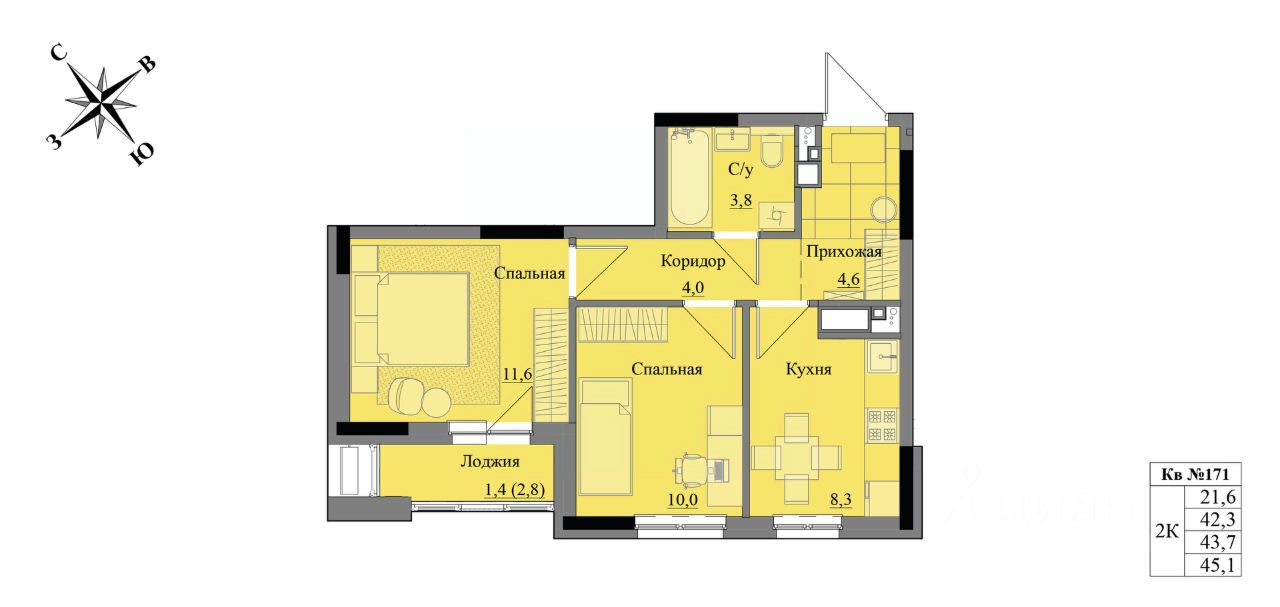 Общая площадь43,7 м2