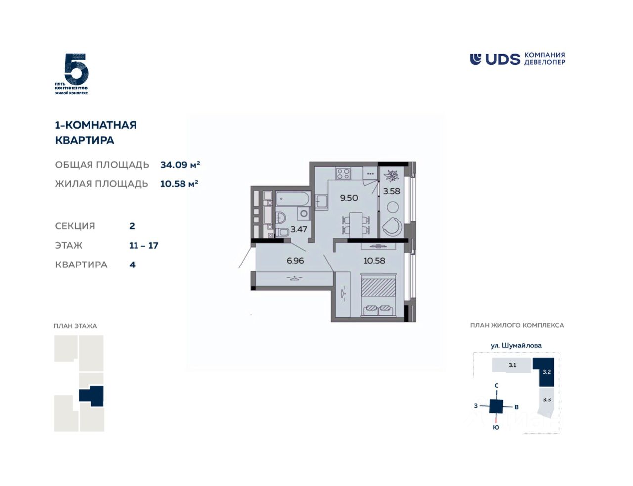 Продаётся 1-комнатная квартира от девелопера UDS в ЖК ''Пять континентов'' в 3 доме комплекса. Секция 2 на 16 этаже. Общая площадь — 34,09 м².
