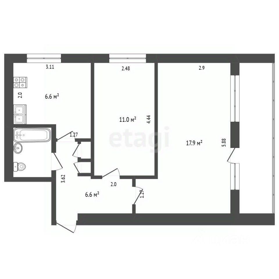 Просторная двухкомнатная квартира площадью 46,2 кв.м. в кирпичном доме с хорошей звукоизоляцией, требует ремонта, что позволяет новому владельцу реализовать собственный дизайн-проект. При этом все скрытые инженерные системы приведены в порядок: произведена замена водопровода и канализации. Планировка практичная и рациональная: две изолированные комнаты 11 кв.м. и 17,9 кв.м., кухня 6,6 кв.м. и совмещенный санузел. Ключевое преимущество - восточная и южная ориентация окон, а также большая лоджия, выходящая на южную сторону, что создает потенциал для организации дополнительного уютного пространства.