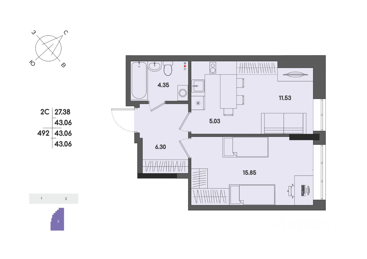 Общая площадь43,06 м2