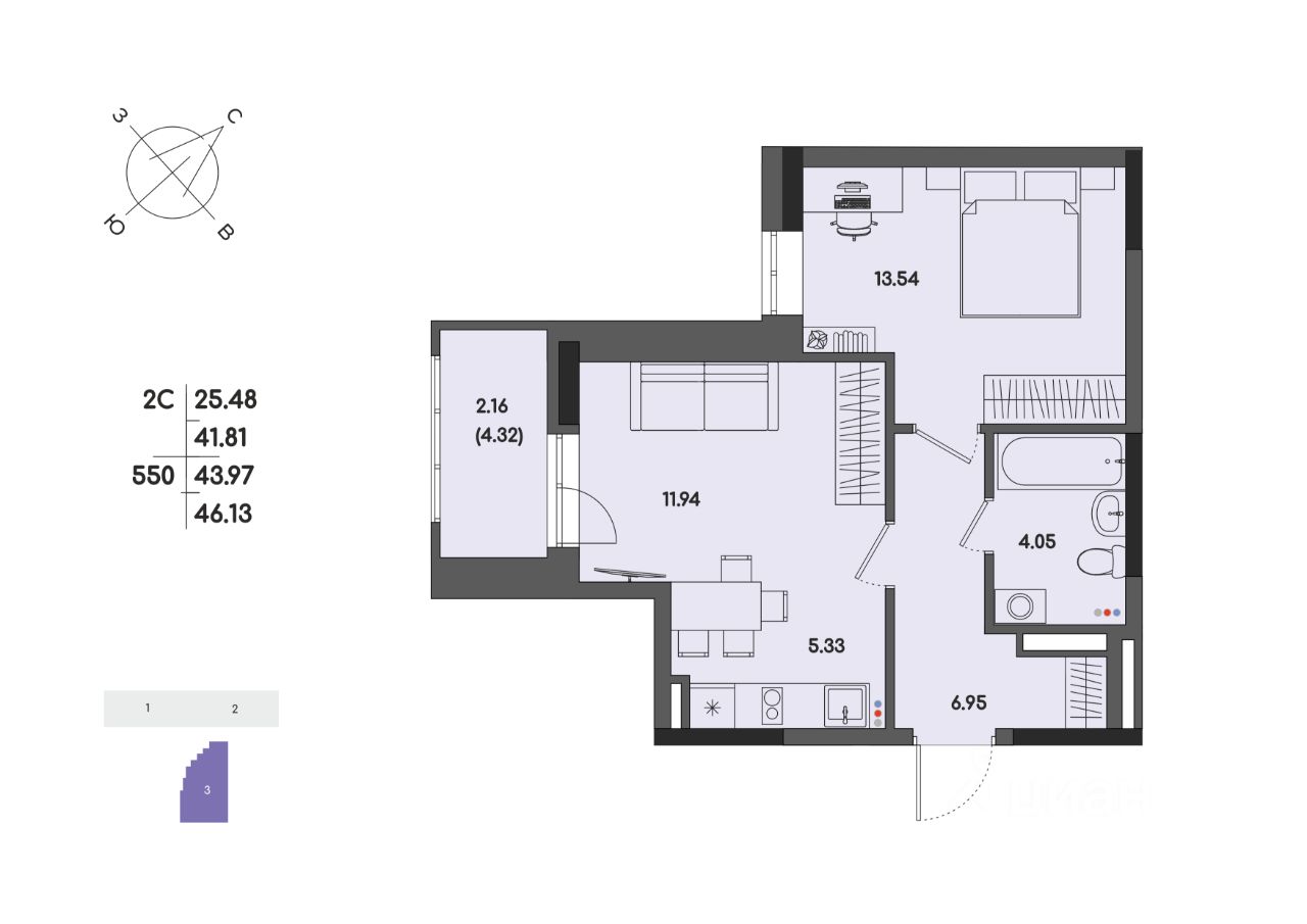 Общая площадь43,97 м2