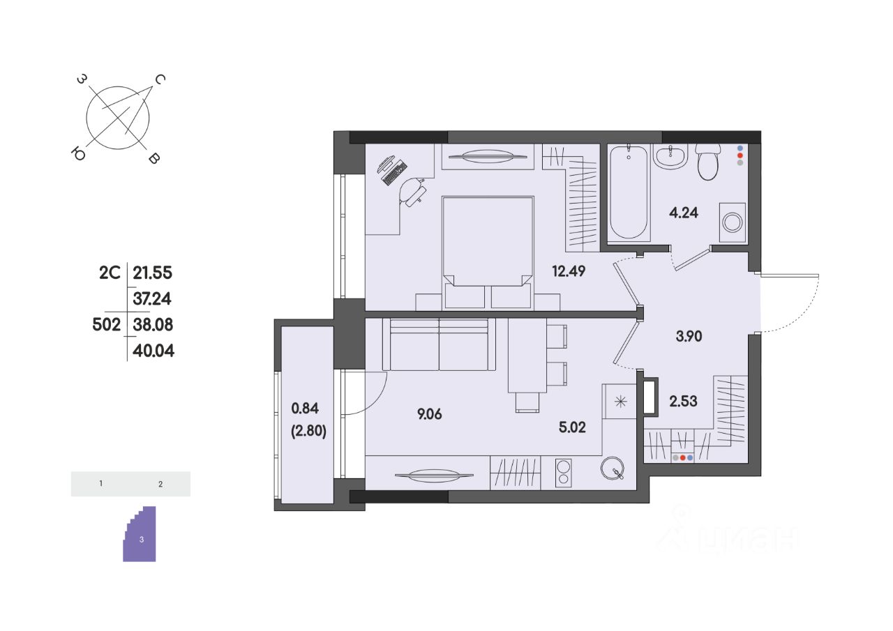 Общая площадь38,08 м2