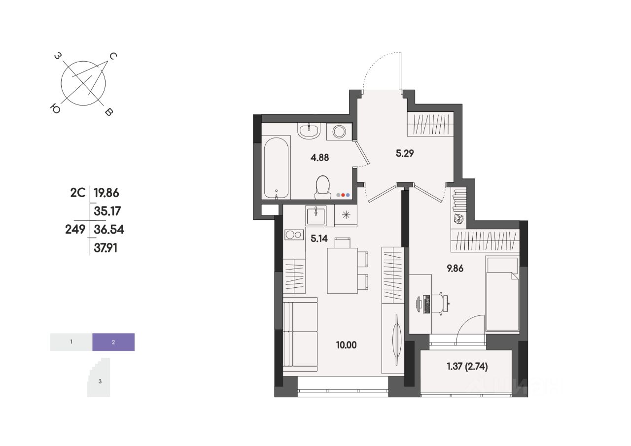 Общая площадь36,54 м2